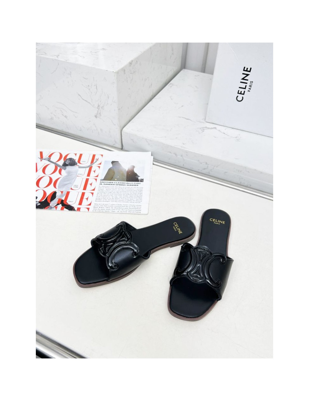 트리오페 로고 레더 슬라이드 샌들 > 셀린느