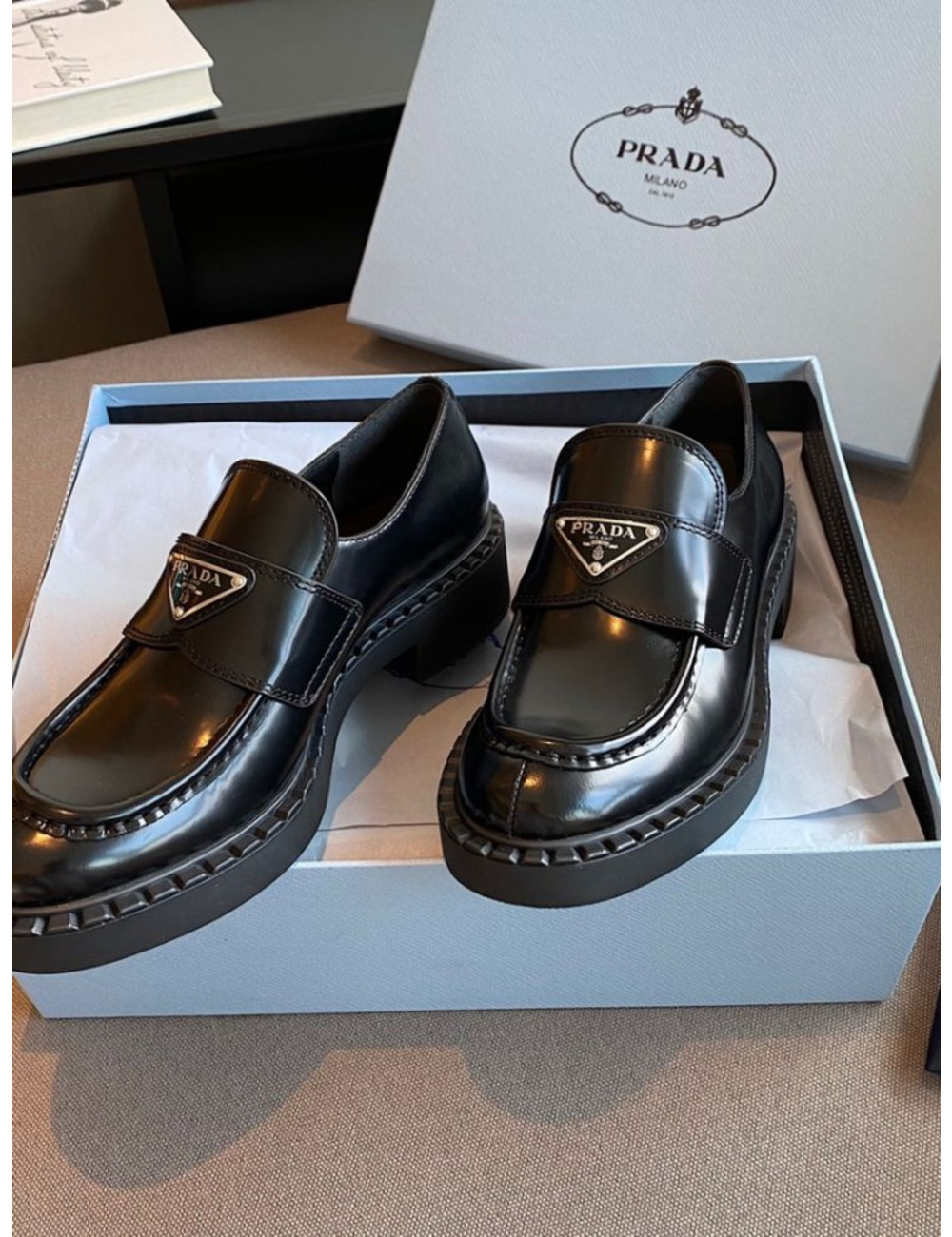 초콜릿 브러쉬드 포인트드 로퍼 > 프라다